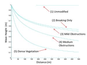 Of these, dissipation by vegetation is the most direct to implement. Using a Morison-equation type formulation, this can be added into the wave model as an additional dissipative source with moderate coding. The details would likely follow Mendez et al. (2004) as volumetric dissipation over the water depth, with appropriate geometrical considerations applied from knowledge of the obstacles. The most difficult aspect of this will be determining the appropriate coefficients for various vegetation types, and determining from land cover/land use or other data how to assign these coefficients for a specific location. This will require significant effort as part of the grid generation process.