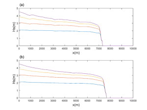 Figure 3. Wave heights along two test transects, with different offshore wave heights. Wave heights in shallow water (~7100m on top subfigure, ~7400m on bottom subfigure) show almost no dependence on initial wave heights.