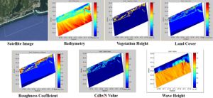 The STWAVE model is aimed at calculating the wave height for different regions if flooded by using different grid types and combination types (max. surge and max. wind, and max. wind and surge at max. wind). The model uses surge, wind, location (latitude and longitude), friction, depth and vegetation data.