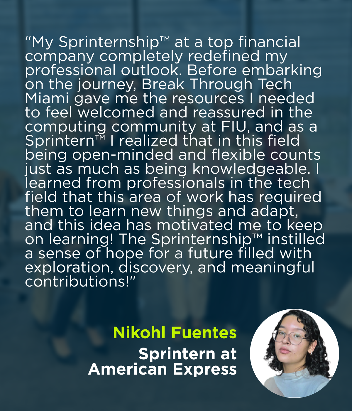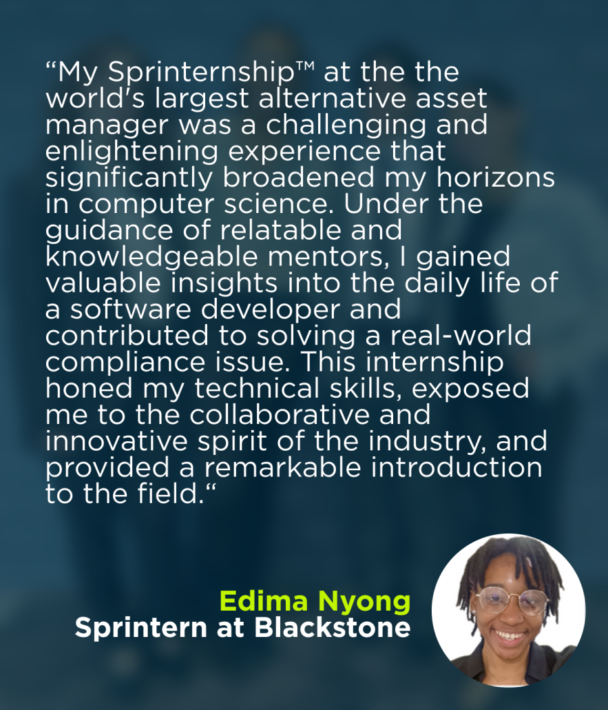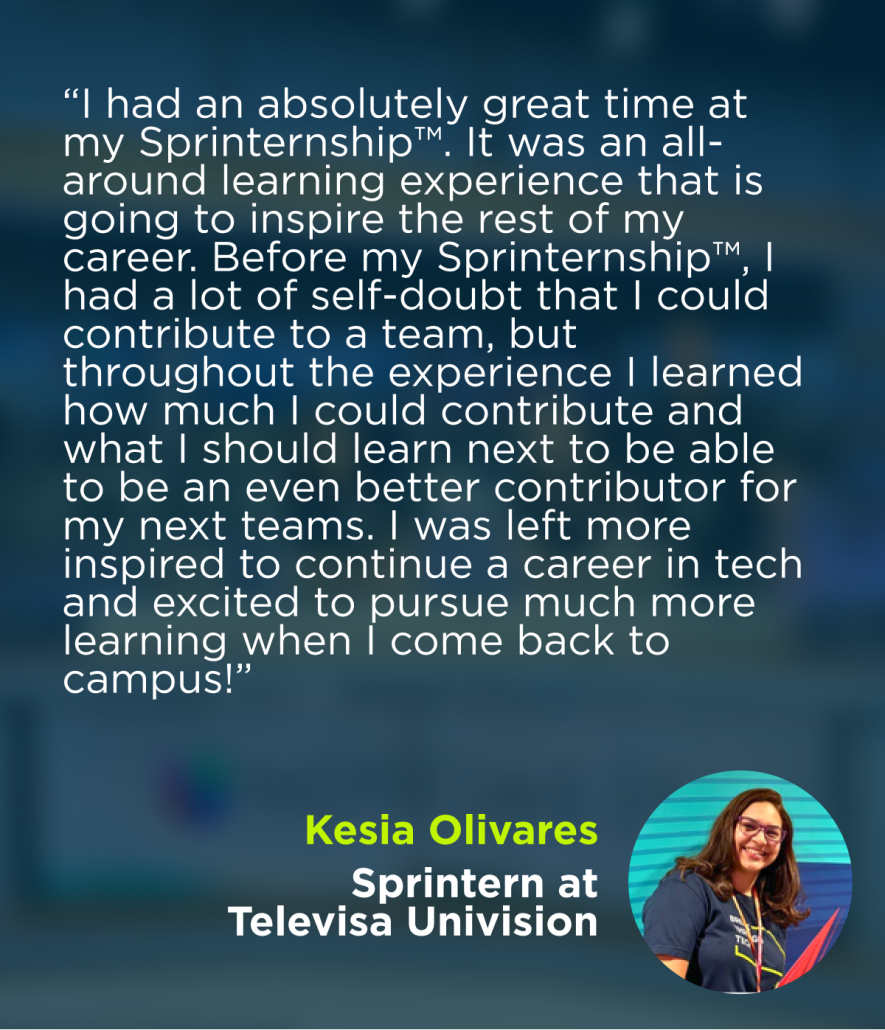 As a student in Sprintership™, our partnership with Break Through Tech, you will participate in a 3-week, immersive, paid internship designed to give you real-world tech experience and a standout résumé credential. This opportunity helps you gain valuable industry exposure and increases your chances of landing a summer tech internship. Each Sprinternship™ is uniquely structured by the hosting company, providing a customized experience that prepares you for the workforce.